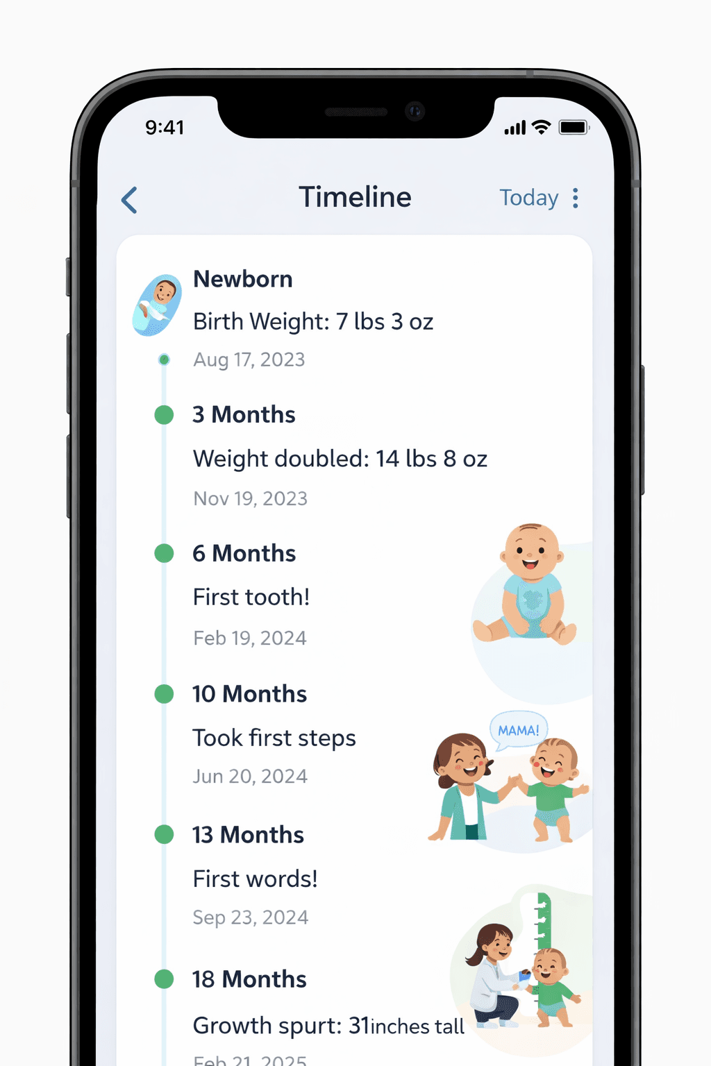 Timeline feature with infinite scroll and growth milestones.