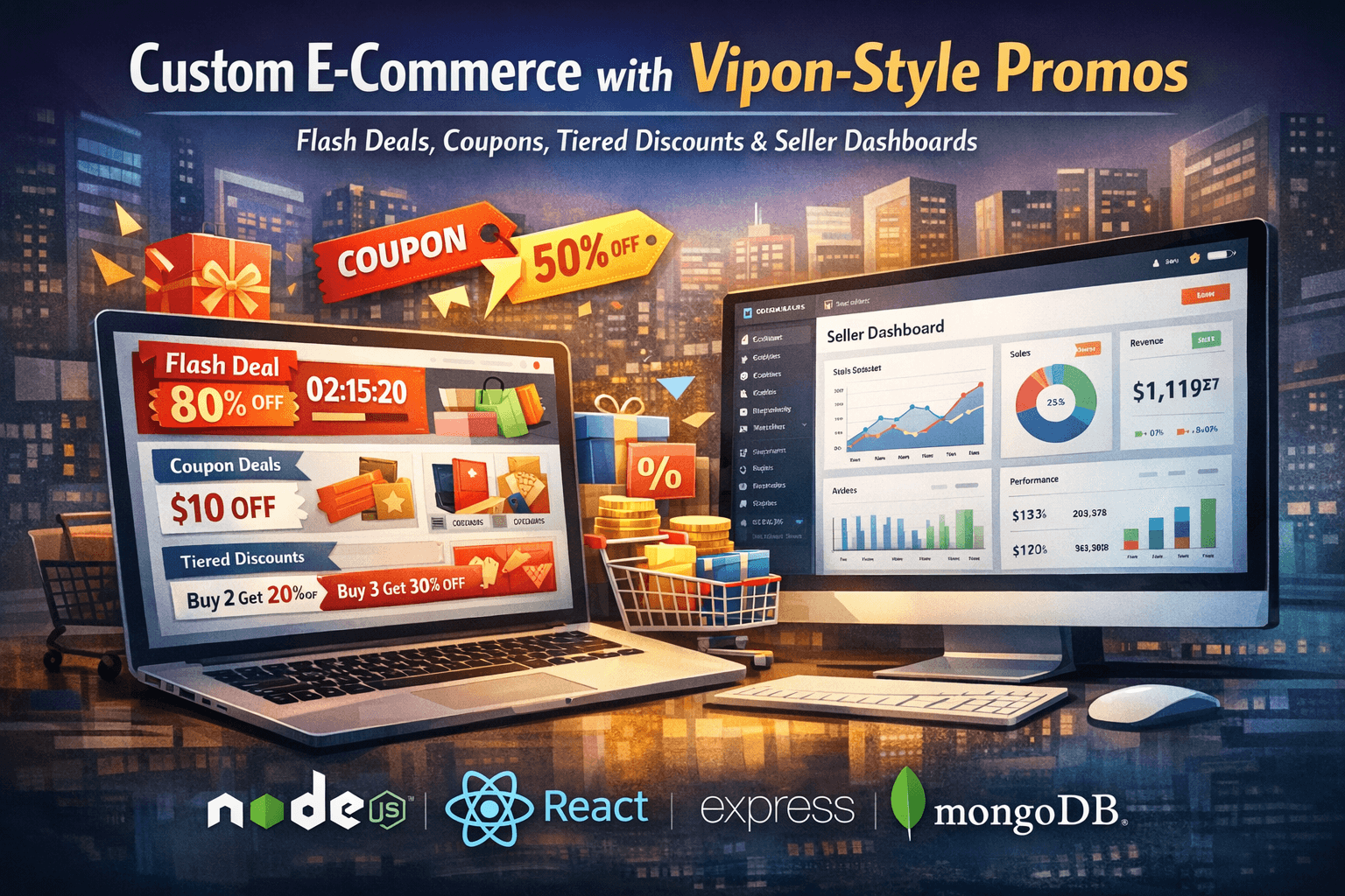 Full-featured e-commerce with deal-sharing, coupons, and referrals.