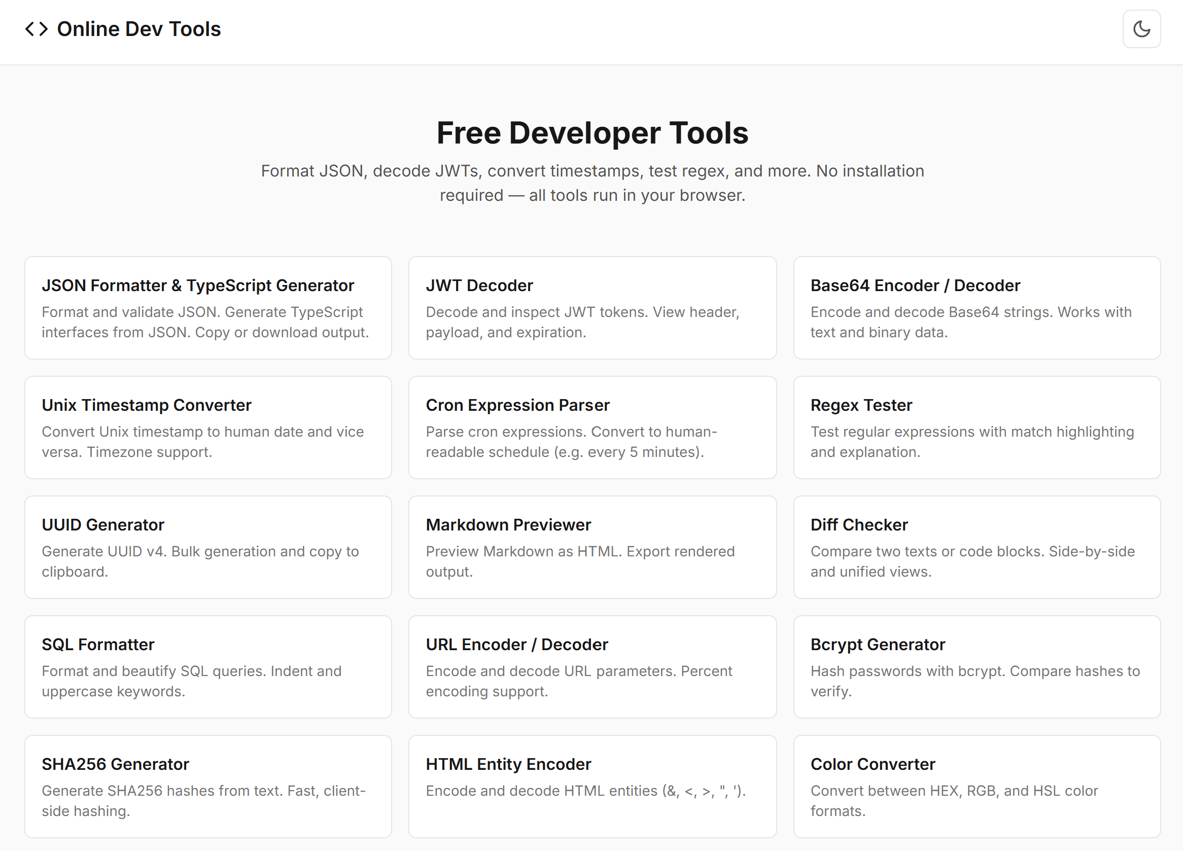 Free browser-based developer utilities (JSON, JWT, Base64, cron, regex, and more).