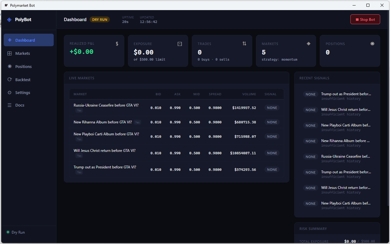 Desktop Polymarket trading bot with live dashboard, strategies, and risk controls.